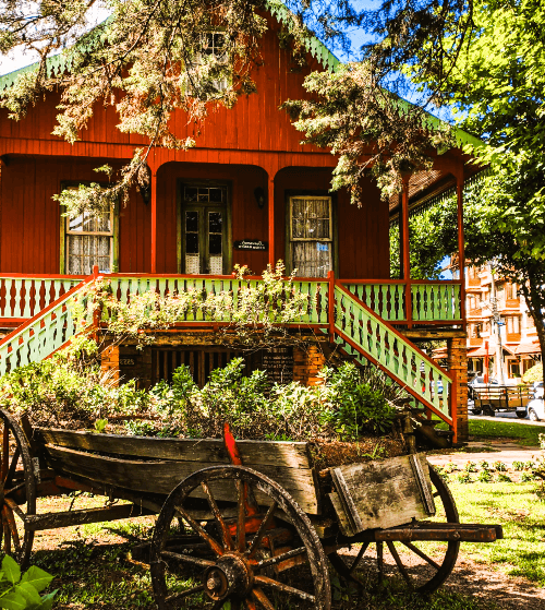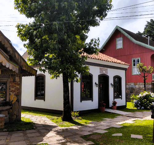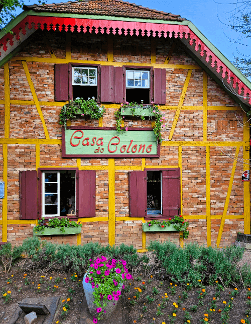A praça é um show de arquitetura, com réplicas de casas coloniais que representam as etnias fundadoras: a Casa Alemã, a Italiana e a Portuguesa. A beleza está nos detalhes, como o estilo enxaimel alemão, as fachadas de pedra típicas da colonização italiana e a arquitetura portuguesa que remetem às técnicas antigas.