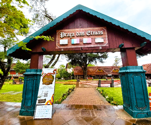 A arquitetura colonial é o destaque da Praça das Etnias, com réplicas de construções alemãs, italianas e portuguesas que resgatam as tradições dos imigrantes. Cada detalhe do espaço foi pensado para homenagear as raízes da cidade e criar um ambiente visualmente encantador.